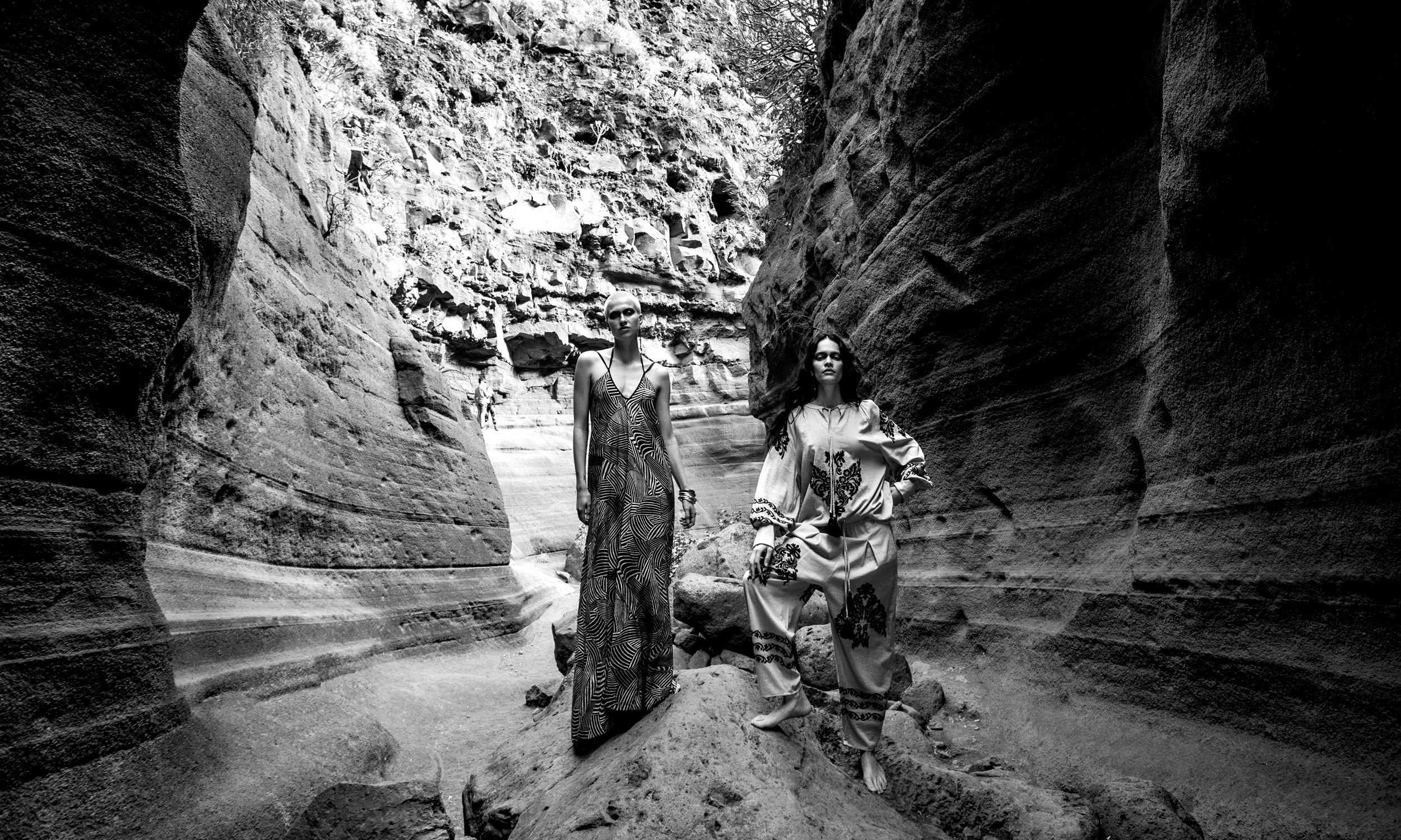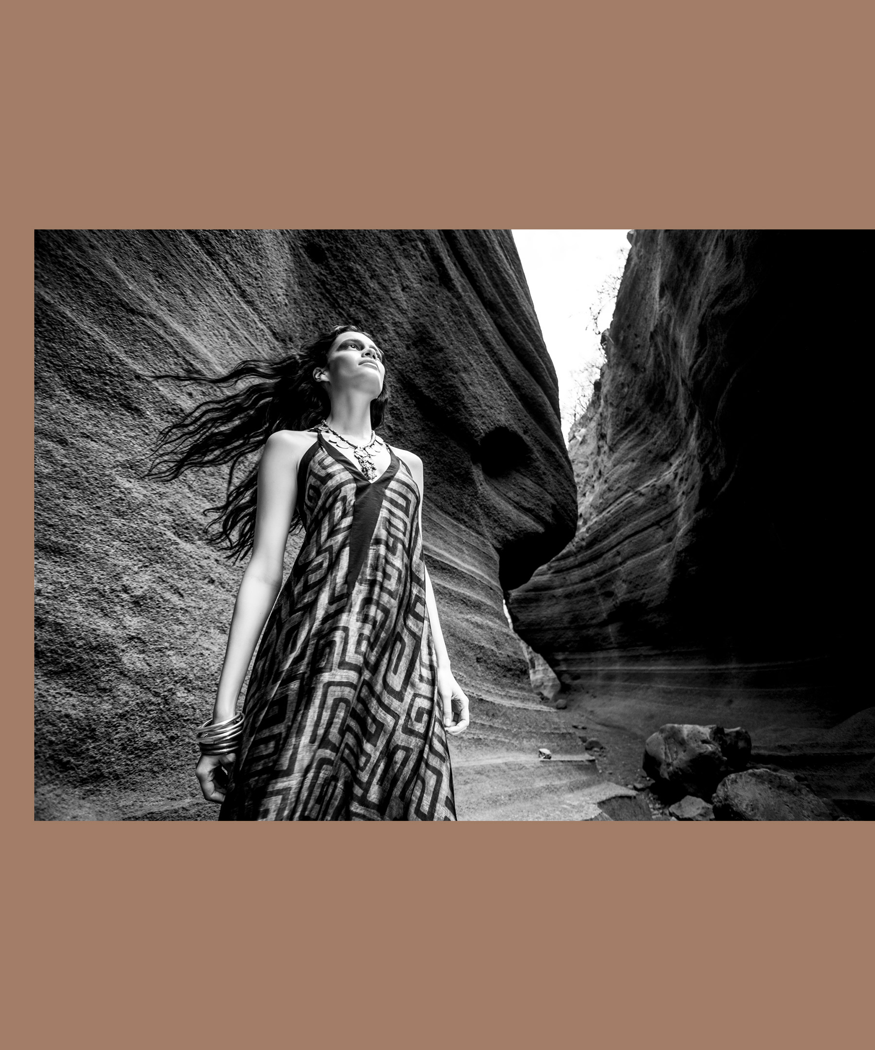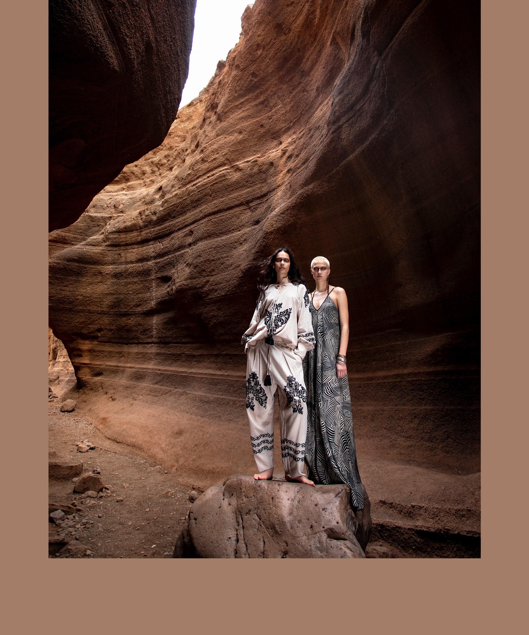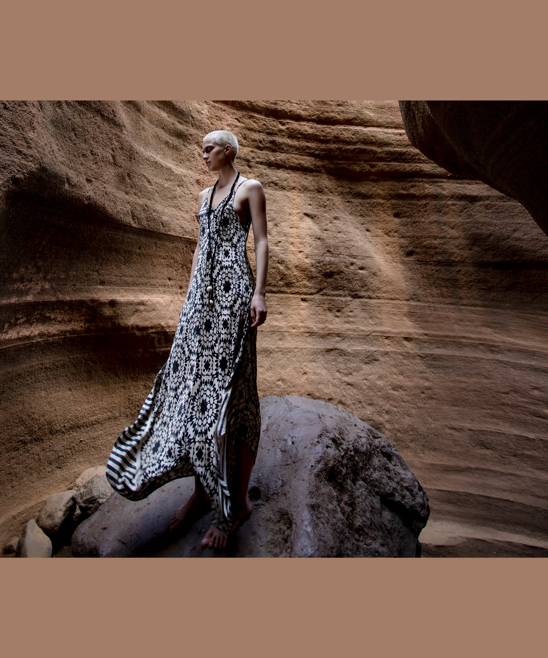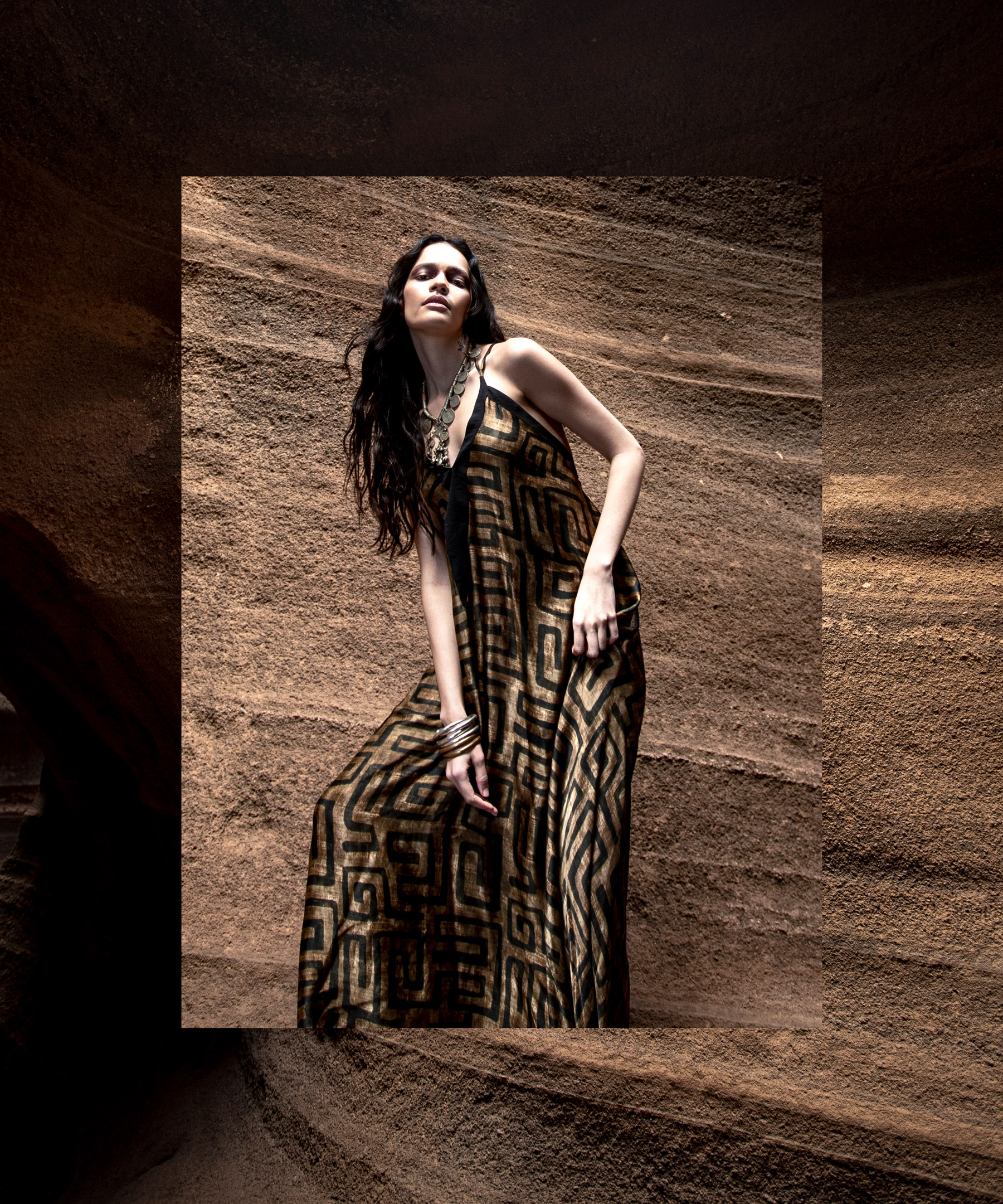 I motivi etnici si uniscono all’oro, scelto nelle sue tonalità più raffinate ed eleganti; bianco e beige sfumano l’uno nell’altro fino a farsi indistinguibili, proprio come è difficile distinguere i diversi toni che compongono una roccia o un albero.