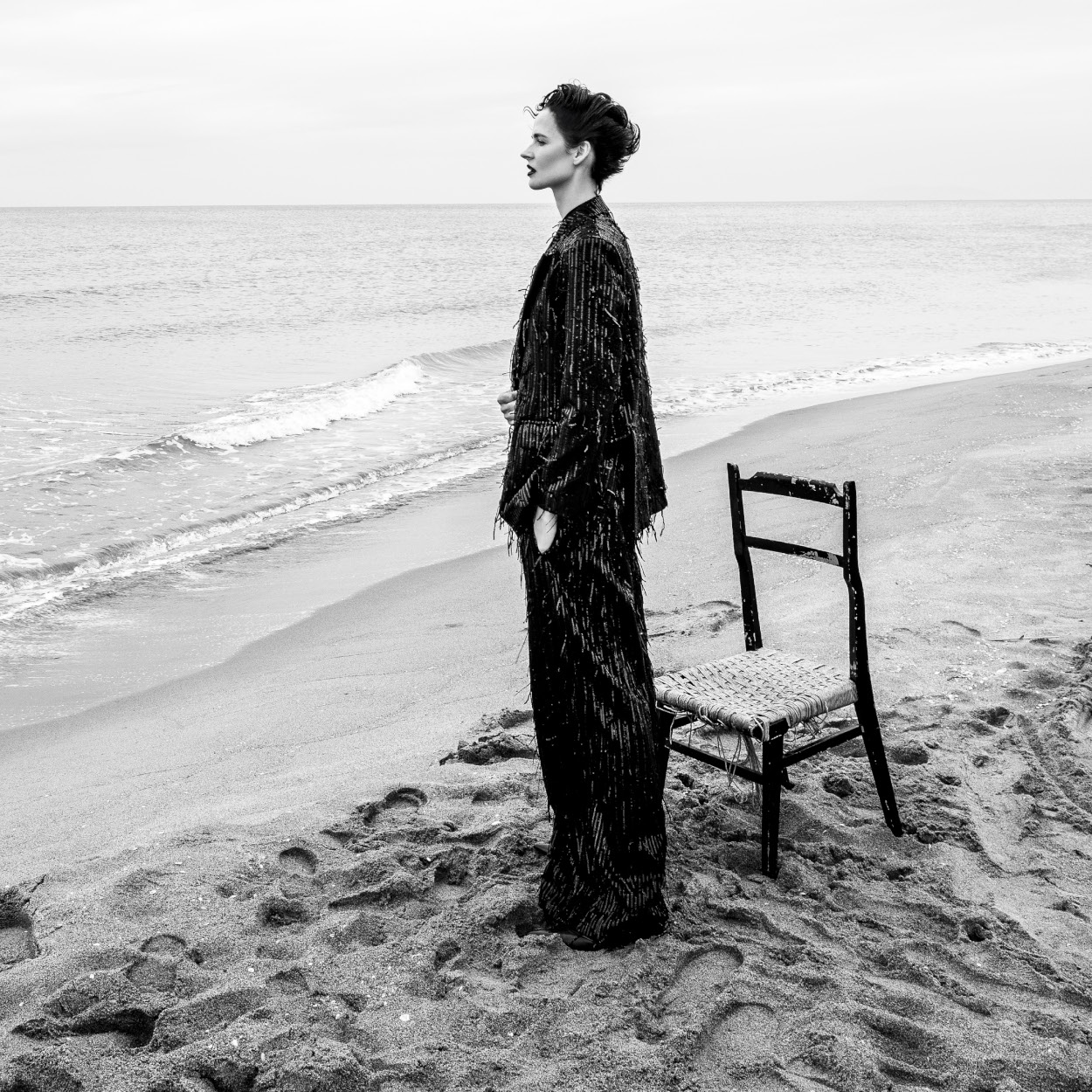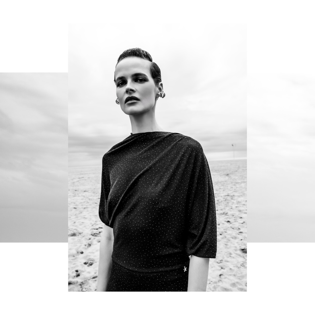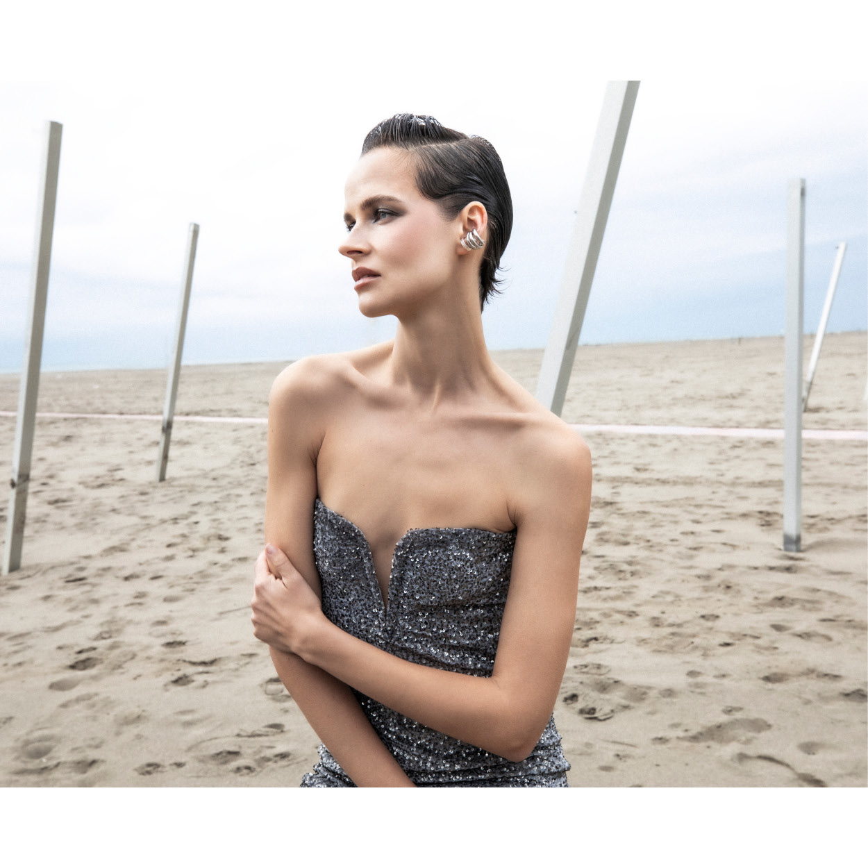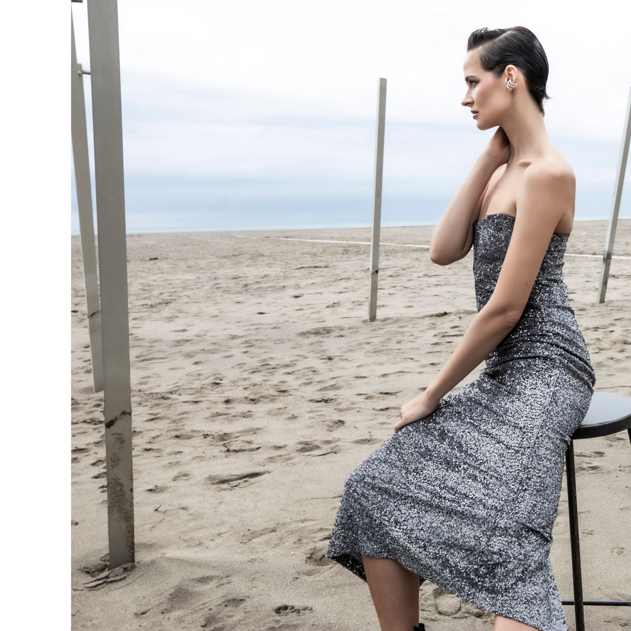Come le onde che danzano sul mare invernale, gli abiti si muovono con leggerezza e armonia. Le linee sinuose, i tagli sartoriali impeccabili e i dettagli preziosi raccontano una femminilitร moderna, avvolta in tessuti che catturano la luce come riflessi sulla superficie dellโacqua.