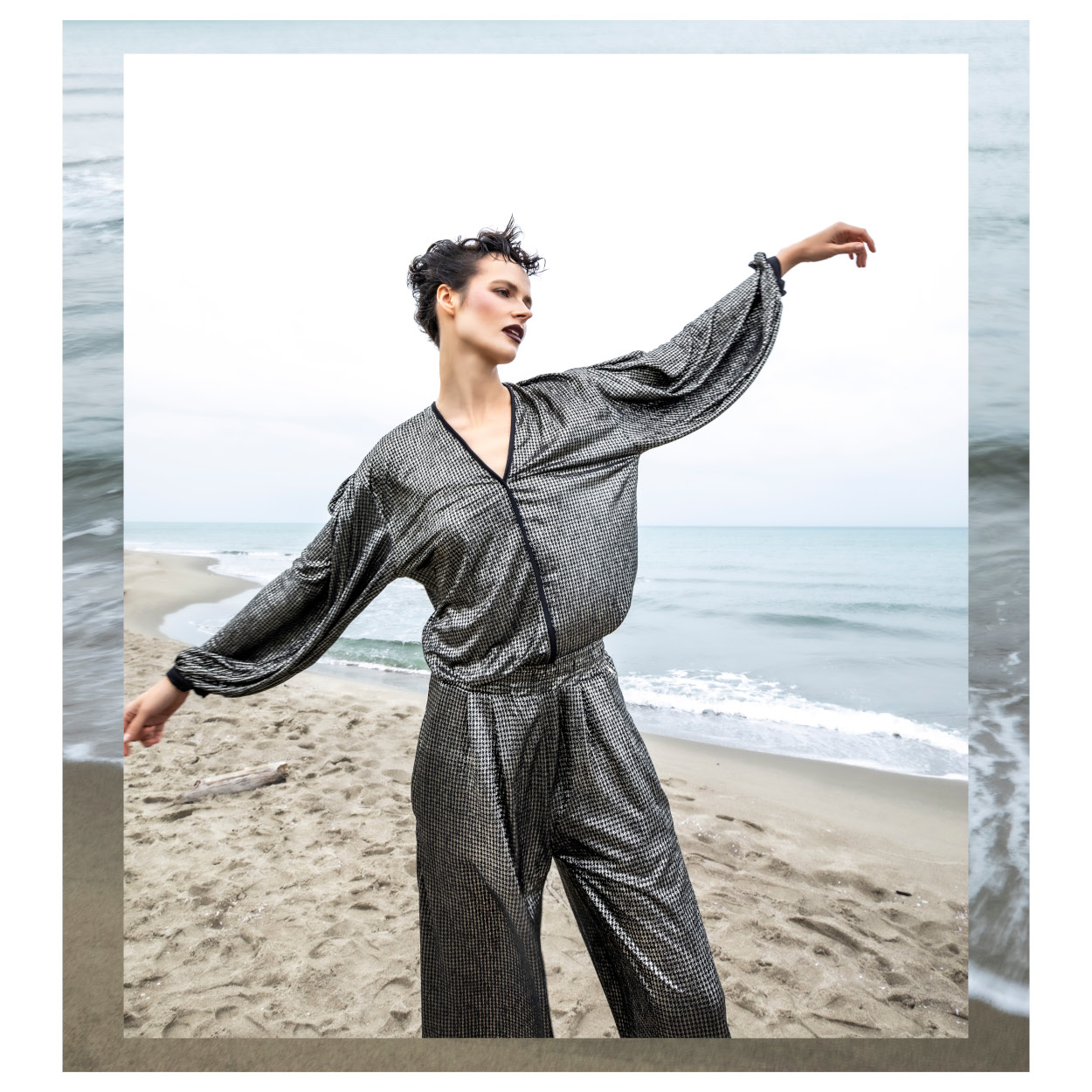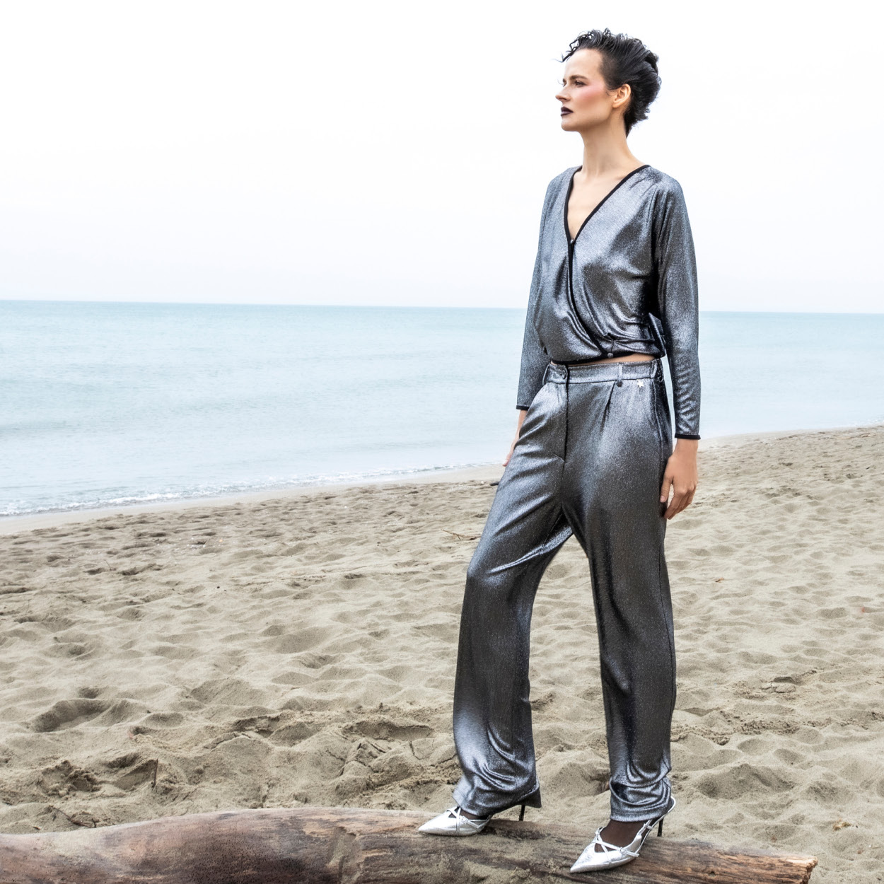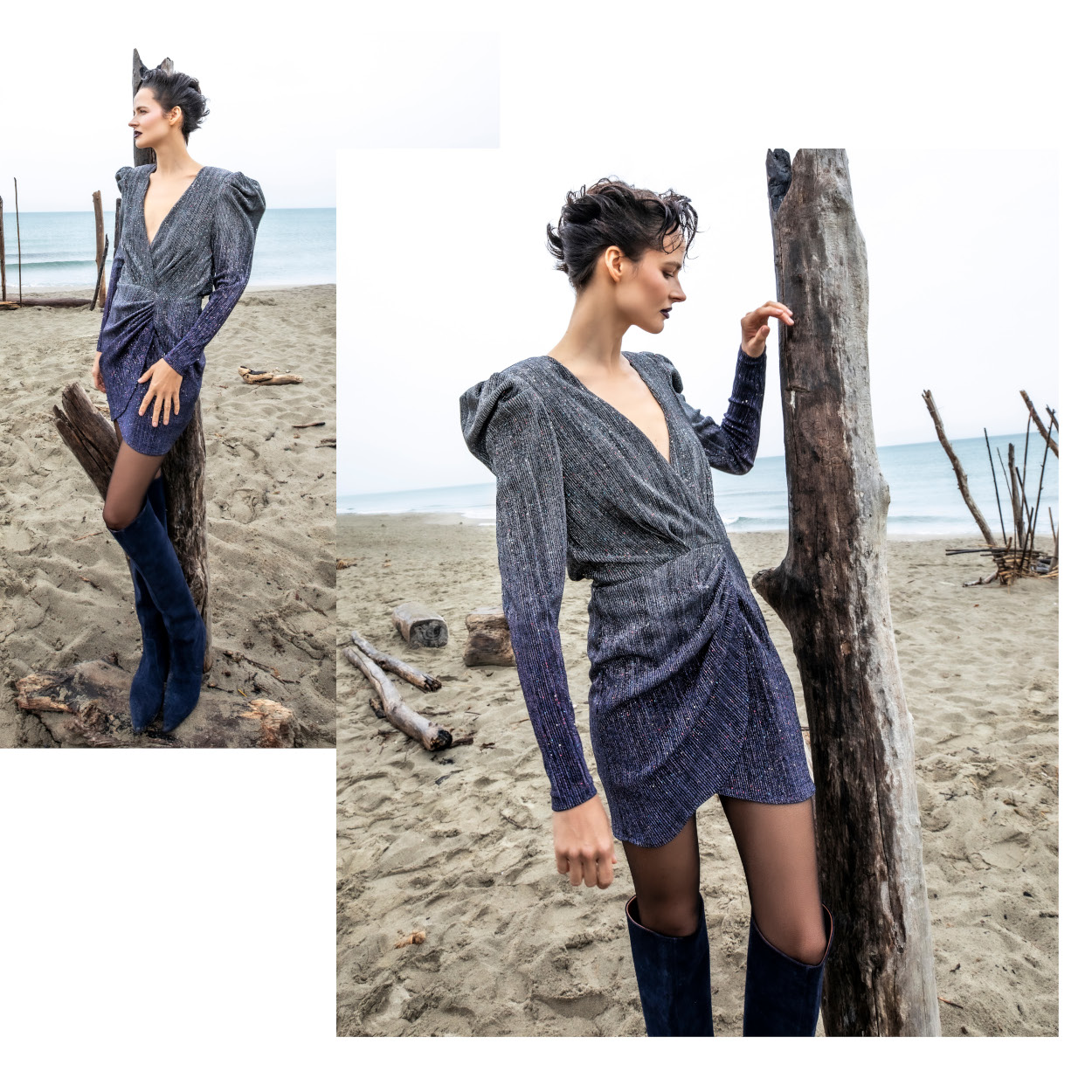 Ogni capo รจ un omaggio alla raffinatezza: abiti da sera che esaltano la silhouette, tute eleganti per eventi esclusivi e pezzi versatili perfetti per brillare durante una festa o una cena speciale. I colori evocano lโinverno, con tonalitร che spaziano dai blu profondi ai grigi perla, arricchiti da accenti dorati e argentati che richiamano le luci del Natale.