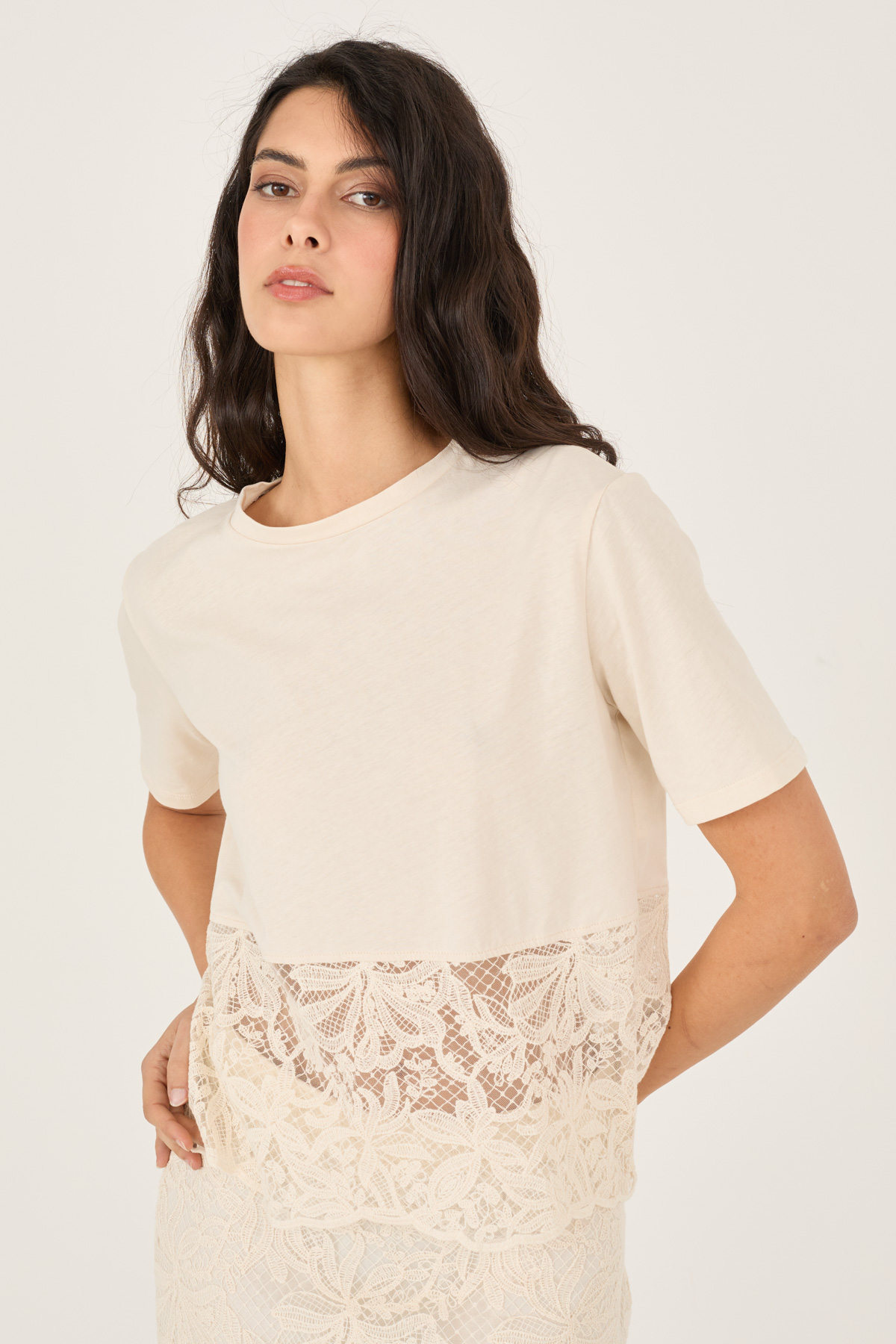 T-shirt in cotone con inserti in pizzo